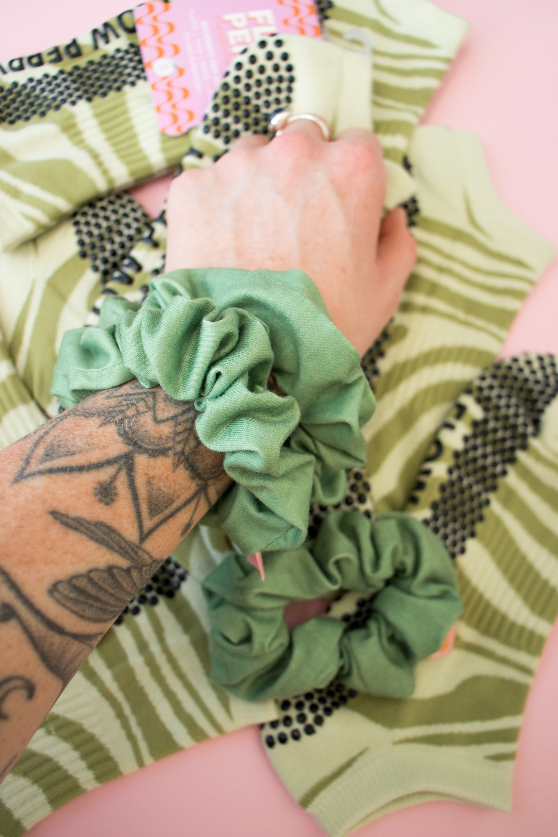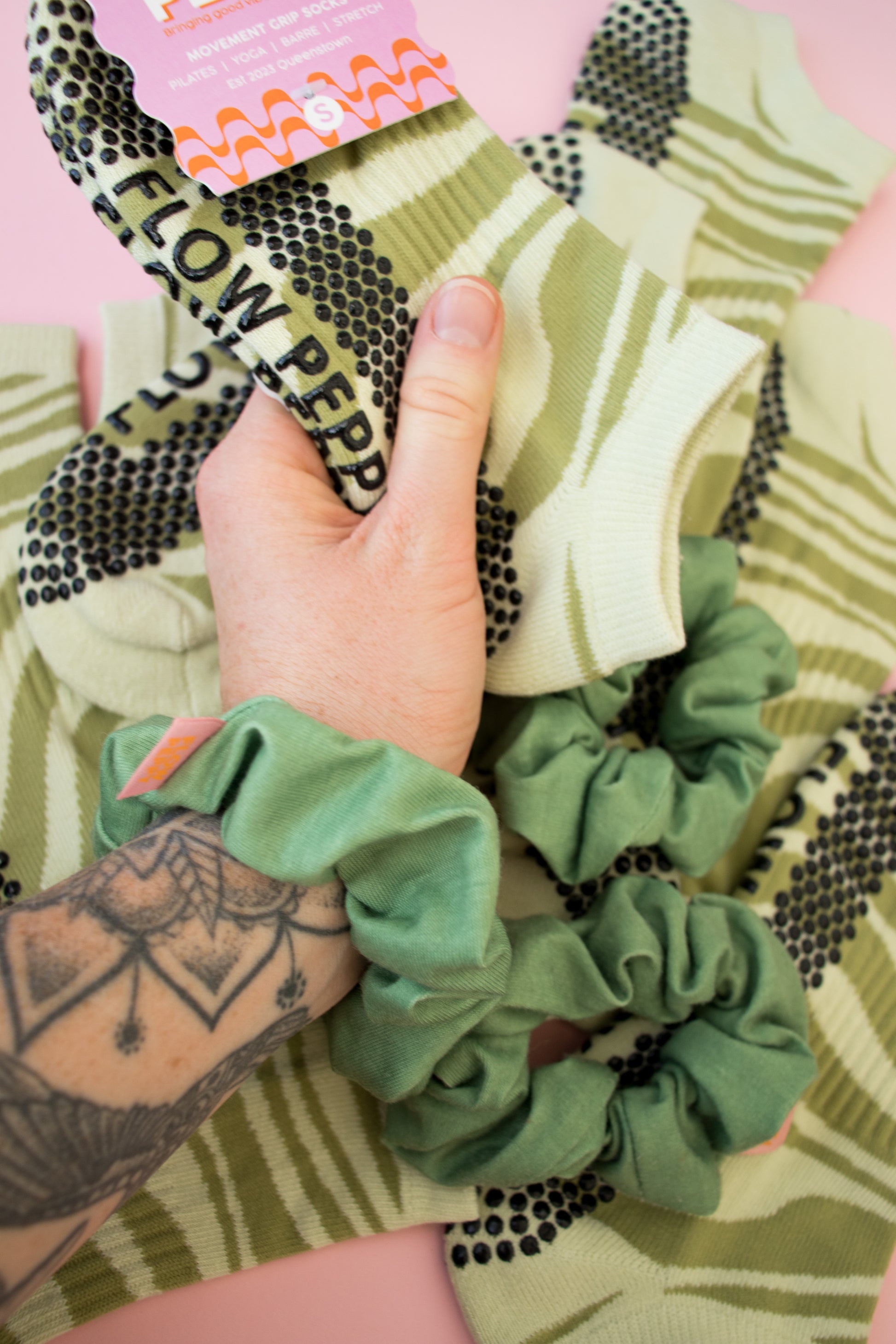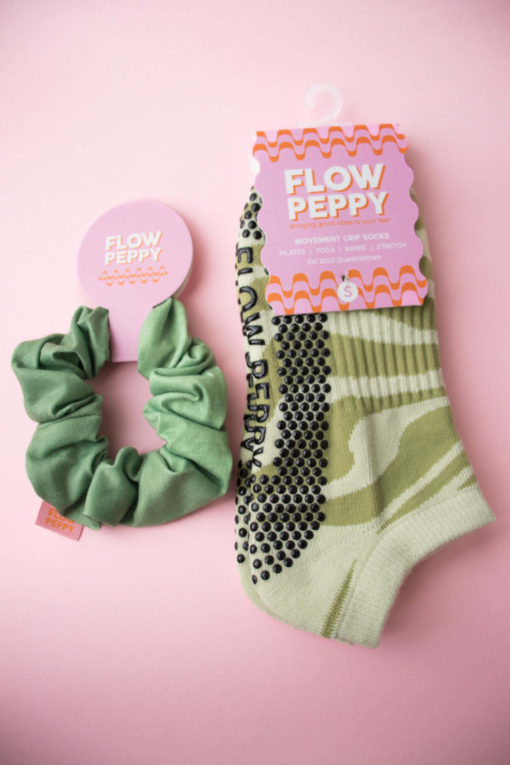 Bringing the good vibes to your feet and your hair with our playful Peppy's. This set pairs the vibey Fresh ankle sock with the stunning green Peppy scrunchie, the ultimate duo for matching your energy from head to toe.