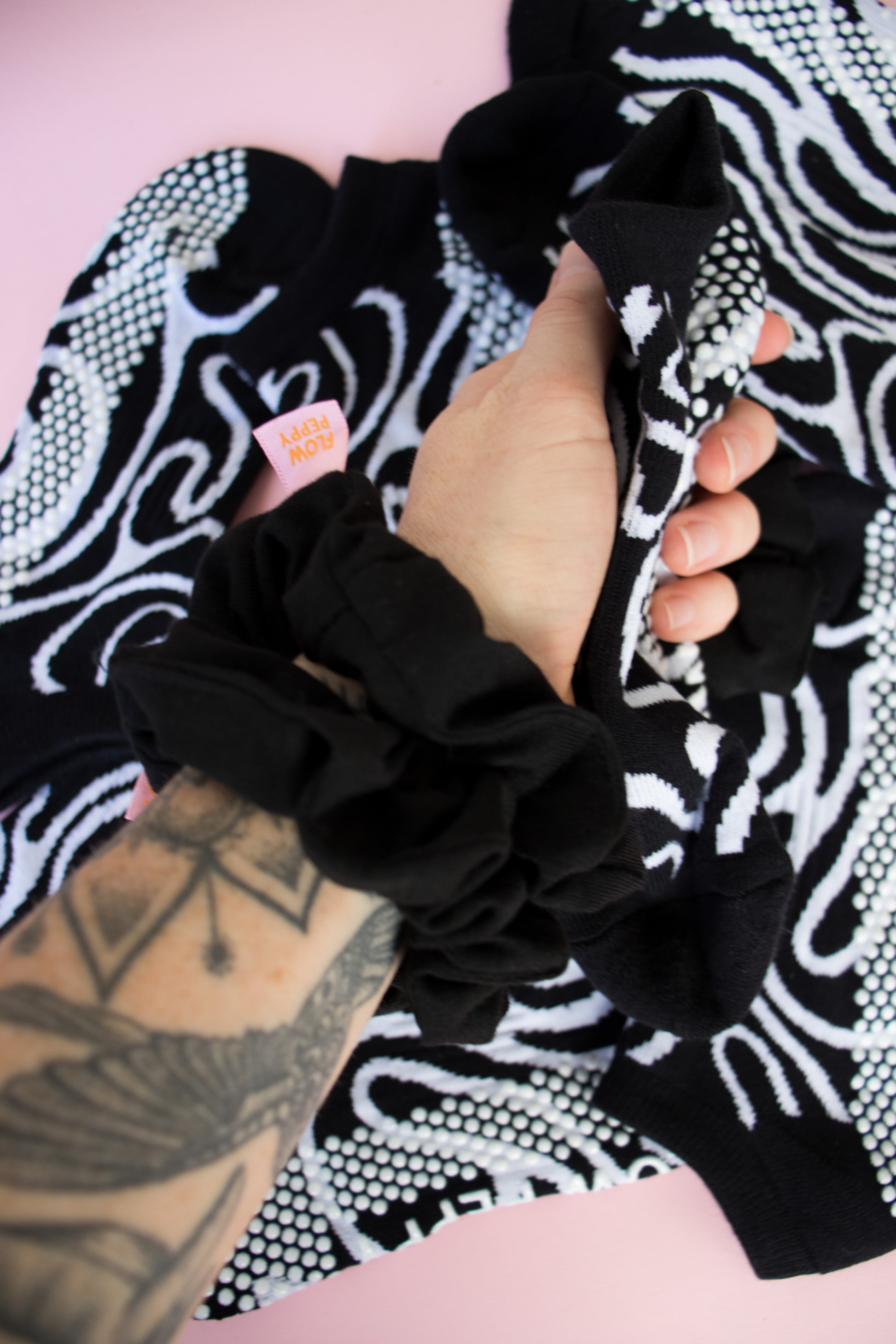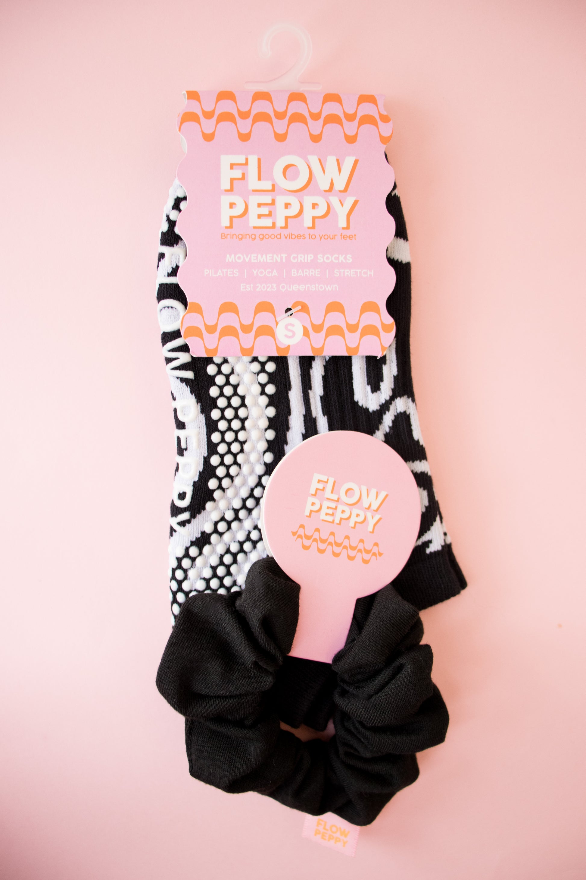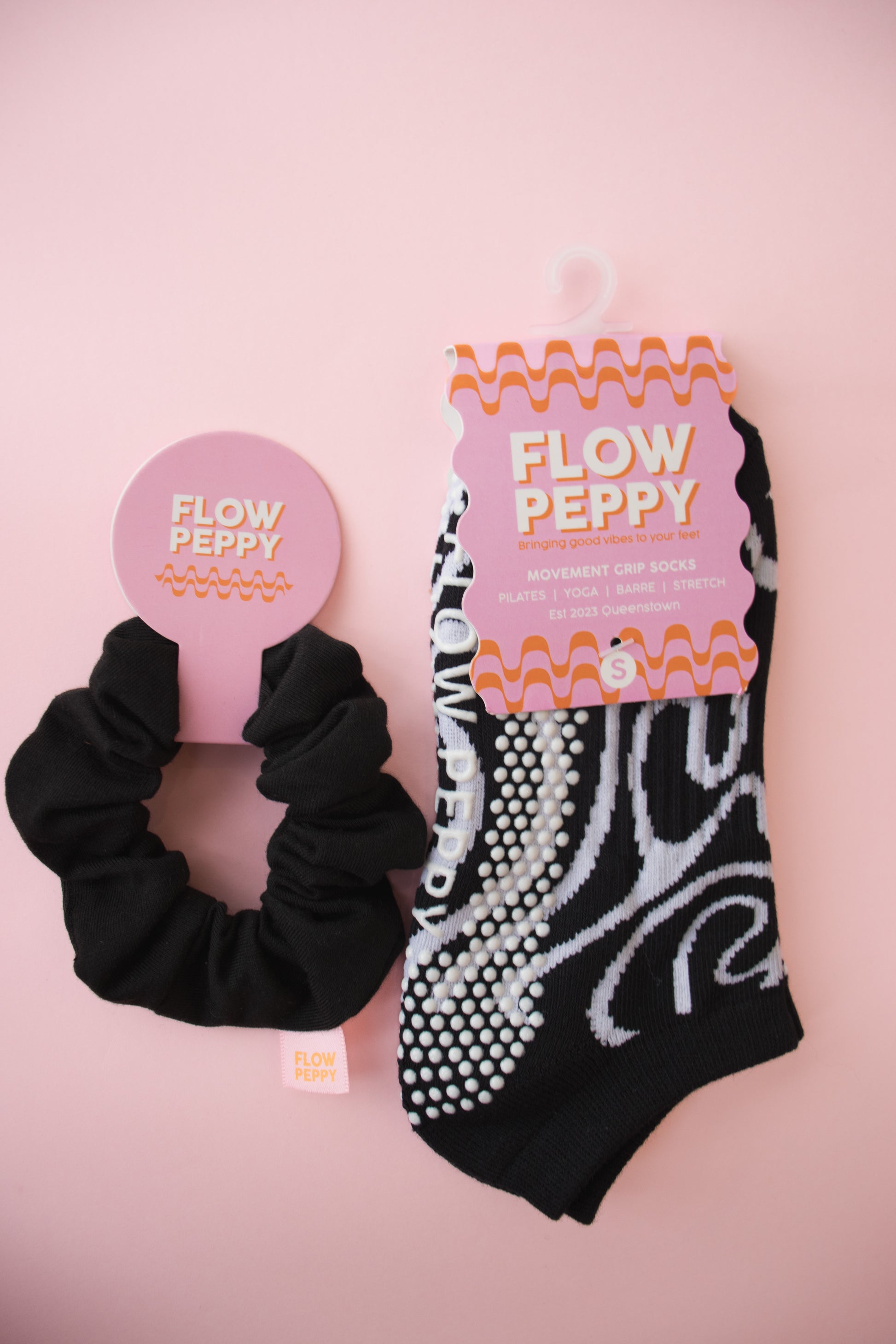 Bringing the good vibes to your feet and your hair with our playful Peppy's. This set pairs the gorgeous Jadore ankle sock with the sleek black Peppy scrunchie, the ultimate duo for matching your energy from head to toe.
