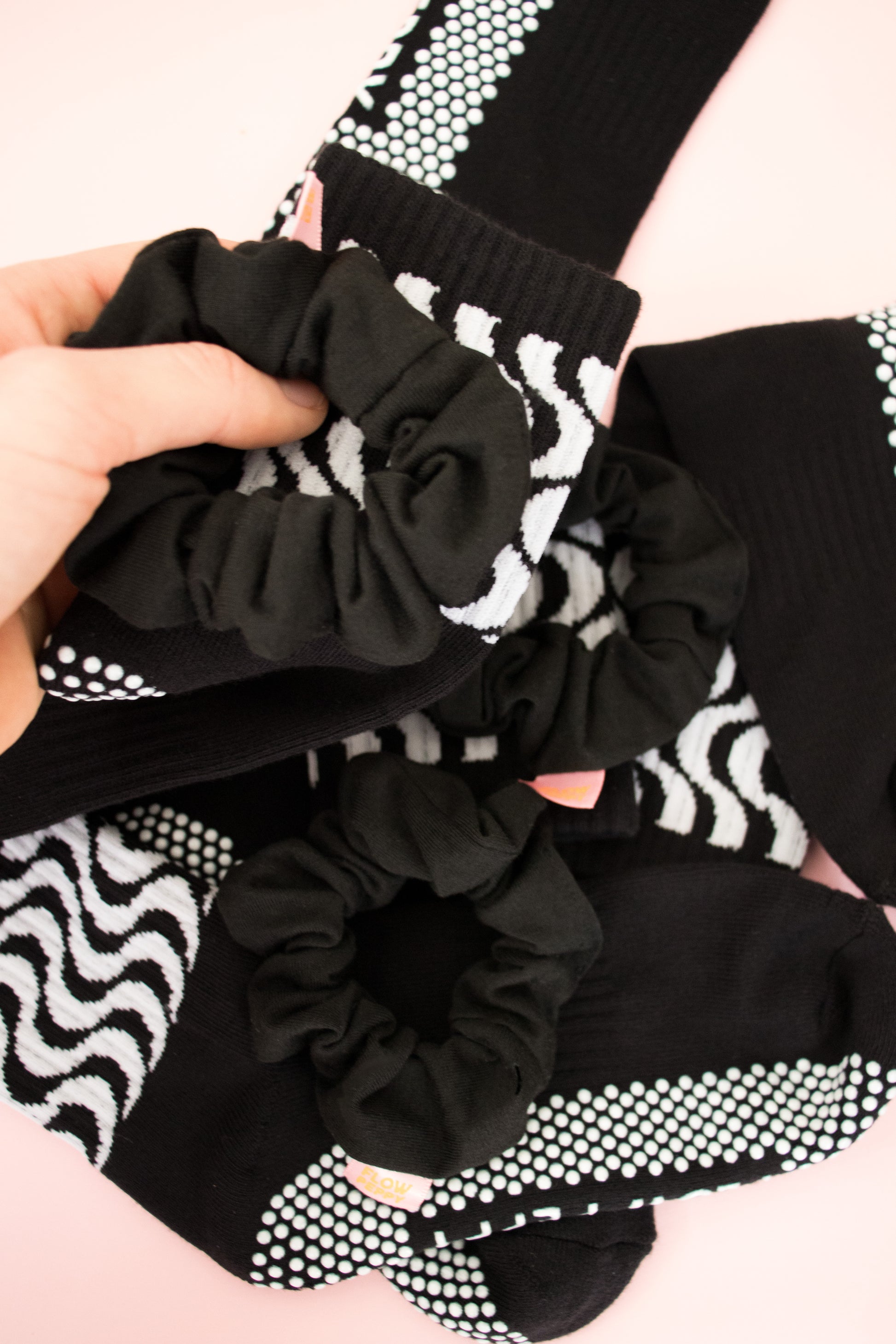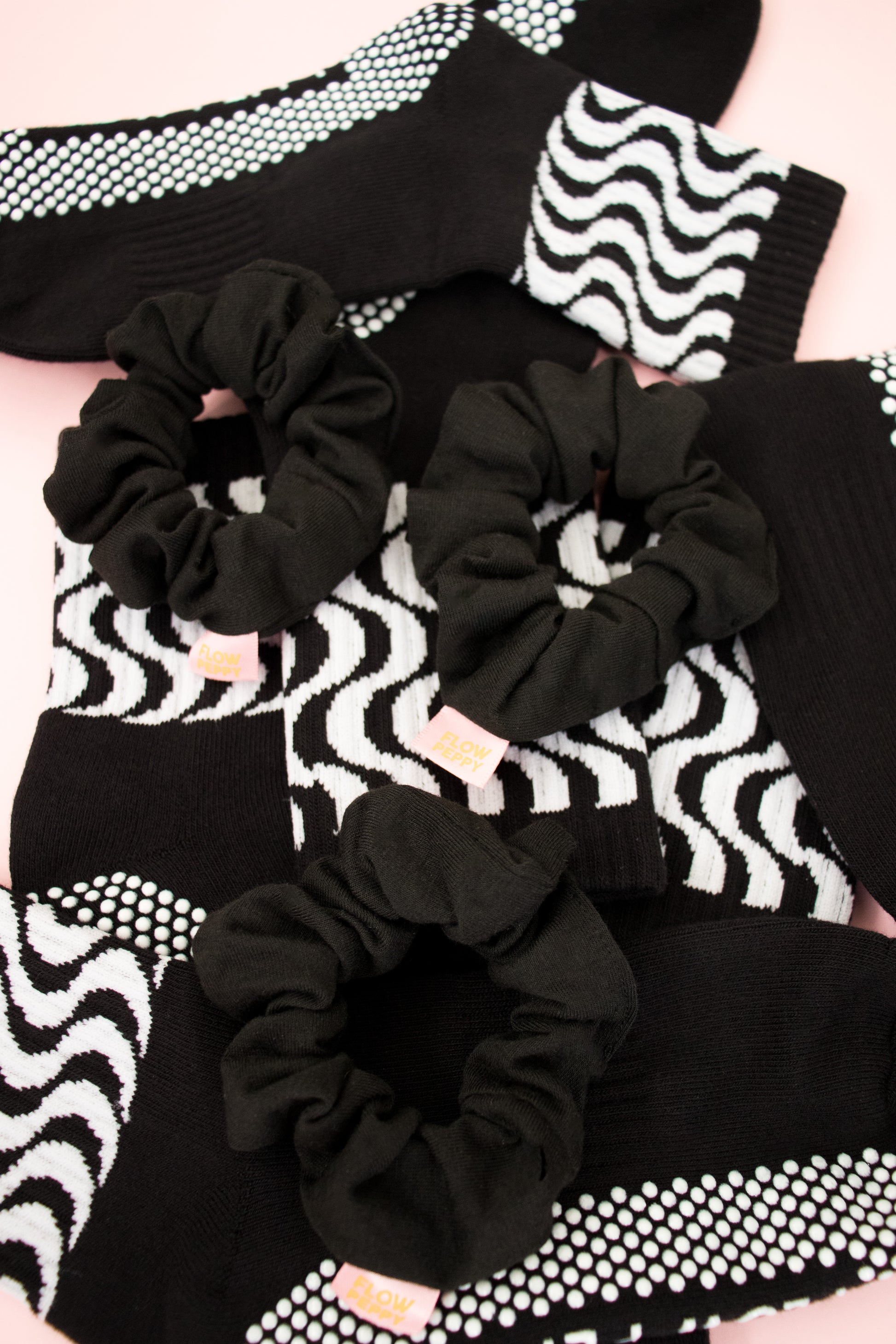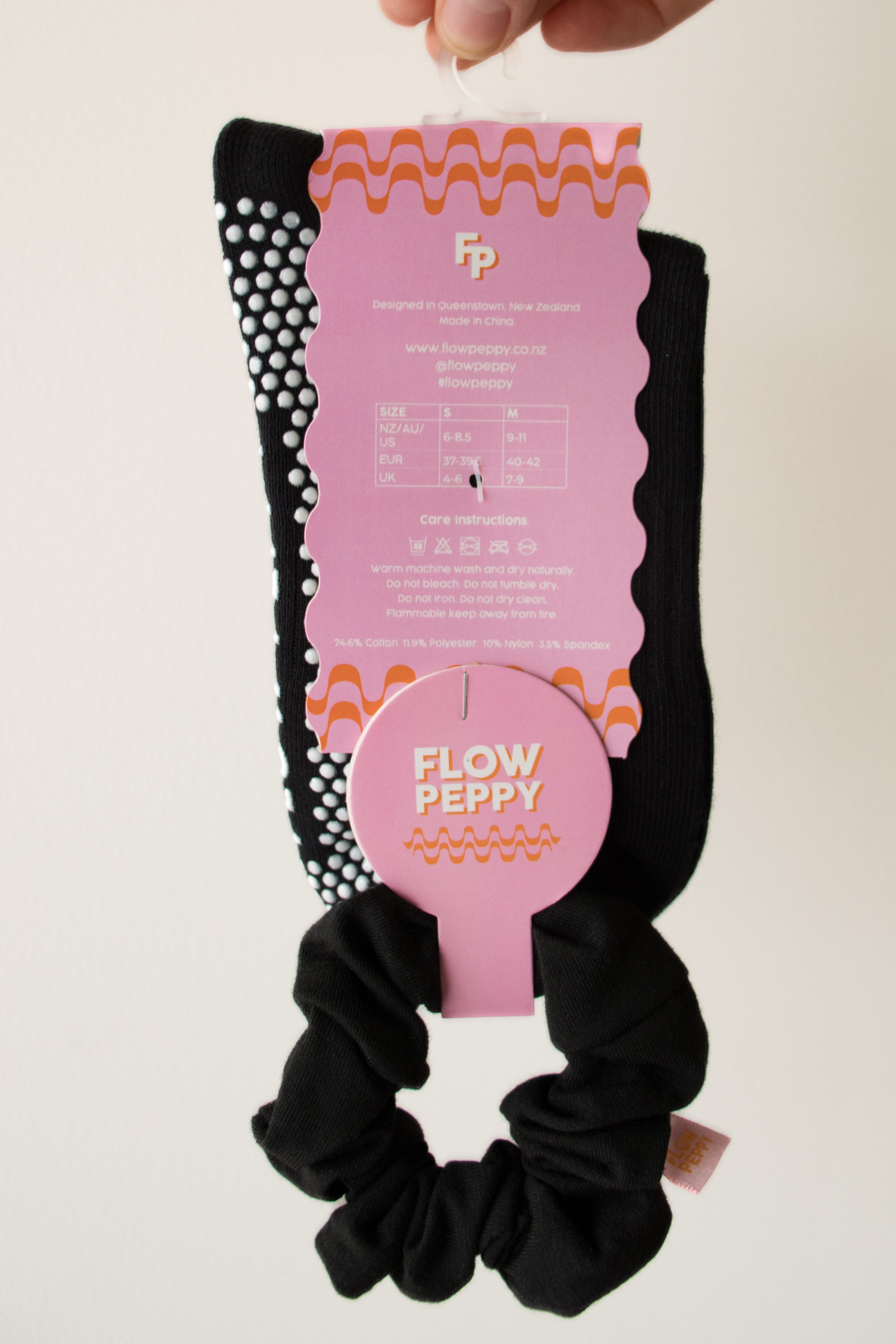 Bringing the good vibes to your feet and your hair with our playful Peppy's. This set pairs the magnetic Rhythm crew sock with the sleek black Peppy scrunchie, the ultimate duo for matching your energy from head to toe.