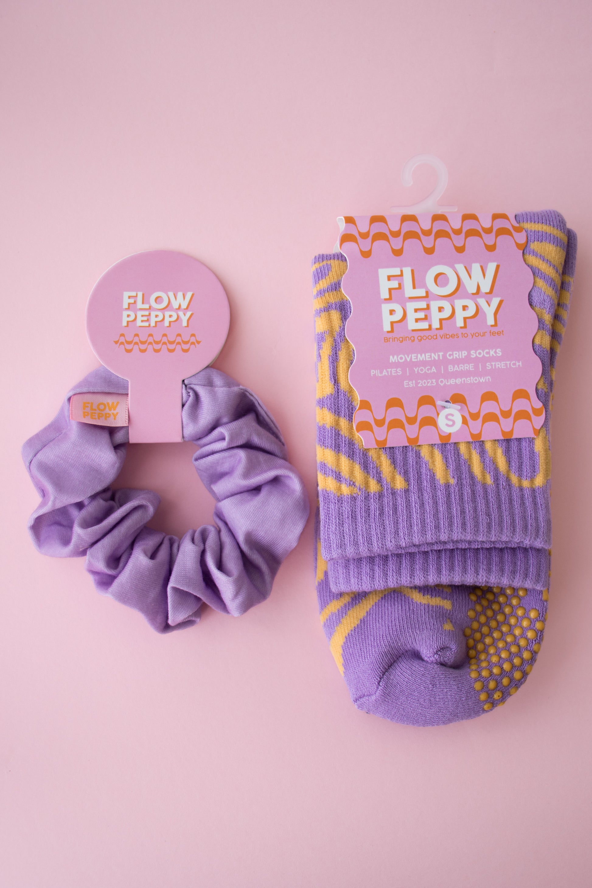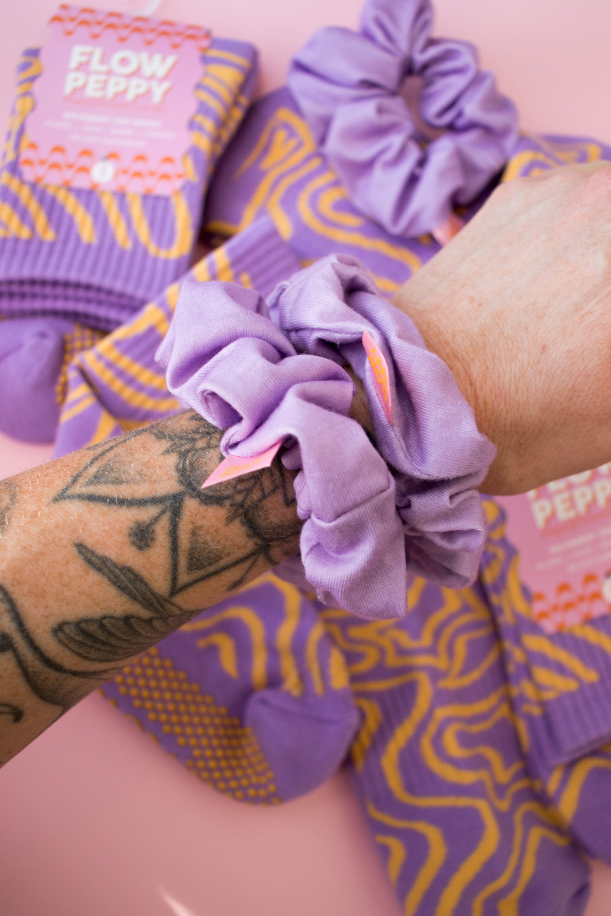 Bringing the good vibes to your feet and your hair with our playful Peppy's. This set pairs the fun Vibe crew sock with the lush purple Peppy scrunchie, the ultimate duo for matching your energy from head to toe.